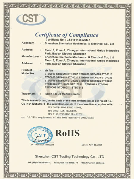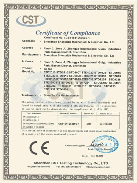 專注定制通風(fēng)散熱風(fēng)機(jī)整套解決方案 深圳市深臺(tái)達(dá)機(jī)電有限公司是一家專業(yè)研發(fā)、生產(chǎn)直流、交流散熱風(fēng)扇、鼓風(fēng)機(jī)、EC風(fēng)扇等通風(fēng)散熱風(fēng)機(jī)產(chǎn)品的公司。來(lái)自我國(guó)資深的高級(jí)工程師研發(fā)設(shè)計(jì),擁有一流的研發(fā)中心,采用全自動(dòng)電腦測(cè)試儀,自動(dòng)繞線機(jī)等先進(jìn)生產(chǎn)和檢驗(yàn)設(shè)備,生產(chǎn)基地位于廣東東莞鳳崗鎮(zhèn),產(chǎn)品應(yīng)用于5G通訊,汽車充電樁,充電樁模塊,無(wú)人機(jī),電磁加熱,高低壓變頻器設(shè)備、伺服與傳動(dòng)設(shè)備,UPS不間斷電源,通訊設(shè)備,激光設(shè)備,醫(yī)療設(shè)備,醫(yī)療器械,空氣凈化器,電焊機(jī),電源系統(tǒng)/電力設(shè)備,除濕除臭設(shè)...CERTIFICATE